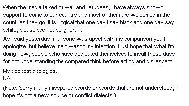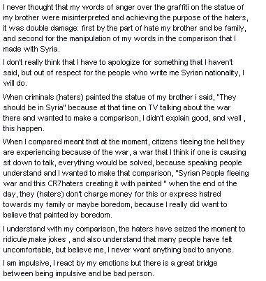 La hermana de Cristiano Ronaldo, molesta por el acto vandálico producido en su país natal, colgó un tuit en el que maldecía a los autores diciéndoles que “tendrían que estar en Siria”, lo que incendió las redes sociales y provocó la crítica generalizada. Pues hace unas horas, Katia ha colgado un nuevo tuit en el que se disculpa por sus palabras, que dice han sido malinterpretadas. “Pido perdón por la comparación (con lo de Siria). No era mi intención. Nunca pensé que mis palabras serían malinterpretadas. Quise decir que hay ciudadanos huyendo de la guerra y otros (los bándalos) provocándola. No soy mala persona”, dice Katia en uno de los párrafos del extenso mensaje.Mensaje De Katia Aveiro!!!!